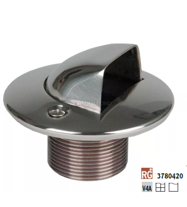 A beömlőfúvóka tartós, saválló AISI 316L rozsdamentes acélból és vörösöntvényből készült. A fúvóka speciális kialakításának köszönhetően a hidromasszázs vízsugarat oldalra irányítják.