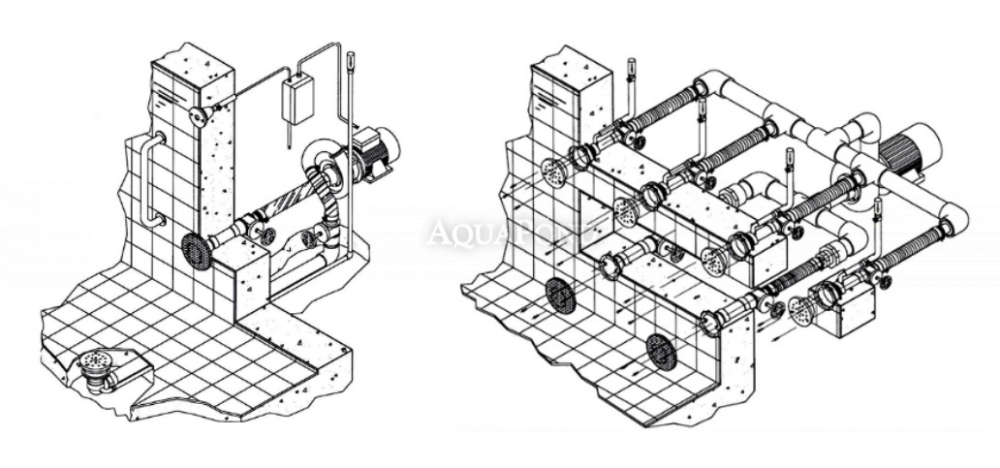 Test dőlésszöge - 90º; Csatlakozási átmérő – Ø2”/63 mm; befecskendező furat átmérője – Ø20 mm; kapacitás akár 10 m³/h. A medence aljára szerelhető.