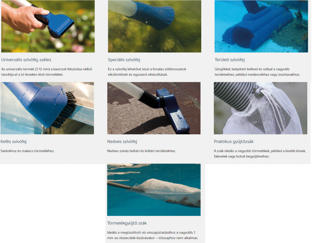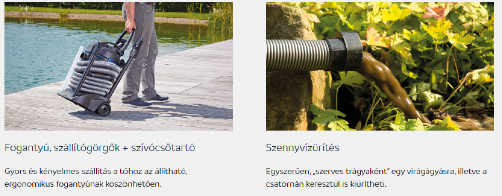 A Pondovac 5 akár 8000 l / h-s szívóképességének köszönhetően dinamikus segítséget nyújt a kerti tavak, medencék és úszótavak tisztításához, emellett nedves porszívóként a házban is használható. A beépített vízelvezető szivattyú révén rugalmasan használható, és különböző magasságokban is képes a szennyezett víz kiszívására. A nagyobb részecskéket, például a kavicsokat vagy a faleveleket előszűrő zsákok tartják vissza, amelyek egyszerűen, egy húzózár segítségével üríthetők. A szívóképesség kényelmesen, munka közben állítható egy manuális vezérlőegység segítségével.