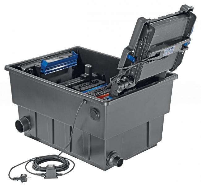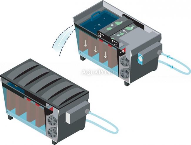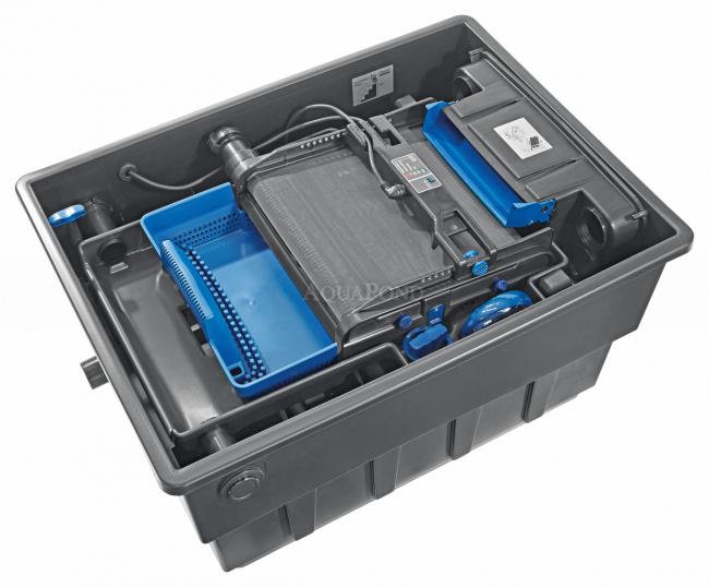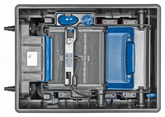 Rendkívül hatékony, legfeljebb 140 m3-es tavakhoz alkalmas átfolyásos szűrő, amely igen csekély karbantartást igényel, mivel a durva szennyeződések még azelőtt elkülönítésre kerülnek, hogy bekerülnének a szűrőbe. Emellett hosszú élettartammal is büszkélkedhet: a kettős szigetelésű motor sokkal hosszabb élettartamot biztosít. Az állítható, automatikus tisztítórendszer hatékony elkülönítési eredményt nyújt. Szűk keresztmetszetek nélküli vízelosztó, amely megelőzi az eltömődéseket. Az innovatív szennyeződésgátlók megakadályozzák a szűrő kimosódását. A tisztítás rendkívül kényelmes: A szűrőszalag gondoskodik a saját tisztításáról, a szűrőszivacsok tisztítására pedig közvetlenül a szűrőben kerül sor.
