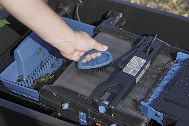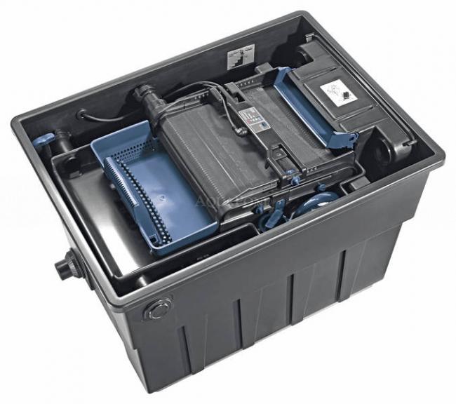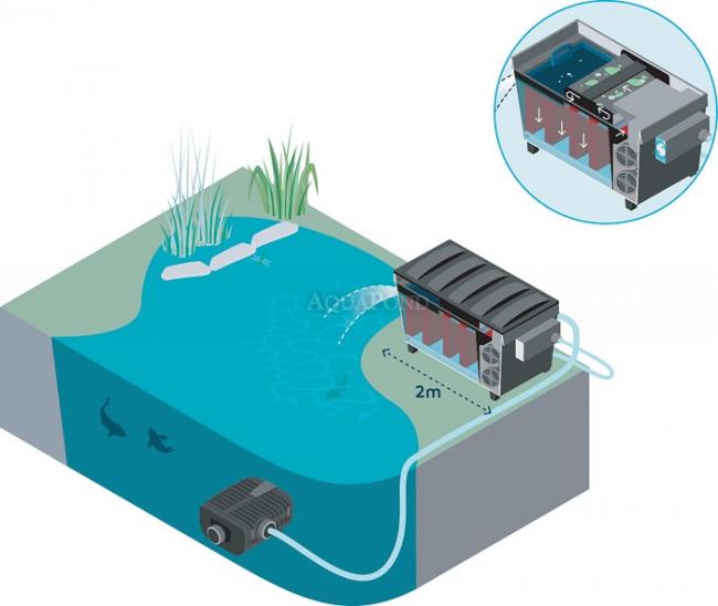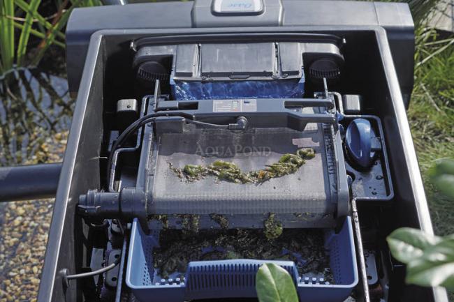 Rendkívül hatékony, legfeljebb 140 m3-es tavakhoz alkalmas átfolyásos szűrő, amely igen csekély karbantartást igényel, mivel a durva szennyeződések még azelőtt elkülönítésre kerülnek, hogy bekerülnének a szűrőbe. Emellett hosszú élettartammal is büszkélkedhet: a kettős szigetelésű motor sokkal hosszabb élettartamot biztosít. Az állítható, automatikus tisztítórendszer hatékony elkülönítési eredményt nyújt. Szűk keresztmetszetek nélküli vízelosztó, amely megelőzi az eltömődéseket. Az innovatív szennyeződésgátlók megakadályozzák a szűrő kimosódását. A tisztítás rendkívül kényelmes: A szűrőszalag gondoskodik a saját tisztításáról, a szűrőszivacsok tisztítására pedig közvetlenül a szűrőben kerül sor.