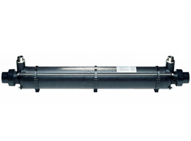 Polipropilén házba szerelt rozsdamentes bordázott titán (Ti típus) csőspirállal, magas korrózió állósággal úszómedencékhez. Sós vizes medencéhez a titán csőregiszteres hőcserélő használható. Hollanderes ragasztható csatlakozás D 50 mm, rögzítéshez a polipropilén bilincs tartozék.