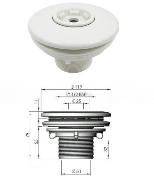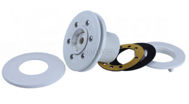 Fehér vagy színes ABS műanyagból, tömítéssel szállítjuk. A karima rögzítése csavarokkal. Fóliával ellátott betonmedencéknél a telepítését átvezető segítségével javasoljuk.