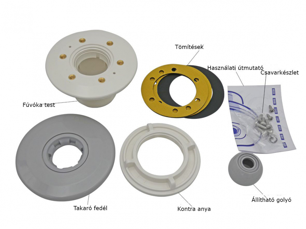 Fehér vagy színes ABS műanyagból, tömítéssel szállítjuk. A karima rögzítése csavarokkal. Fóliával ellátott betonmedencéknél a telepítését átvezető segítségével javasoljuk.