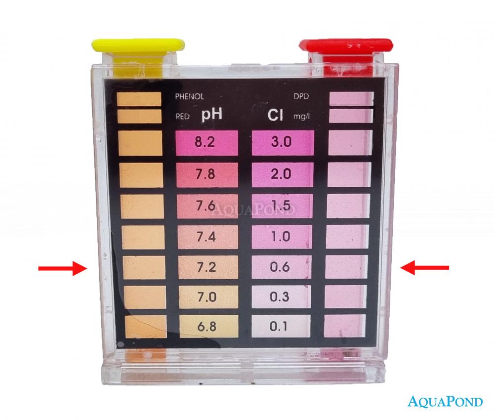 A DPD elemző az Cl/pH tabletta a mintavételi kamrában lévő vízhez adása után, a színeződést vizuálisan összehasonlítja a mellette lévő színskála színekkel, miközben az egyes színek megadott értékeket jelentenek. Az elemzés eredményétől függően módosítjuk a víz értékeket a medencében. Használati útmutató: