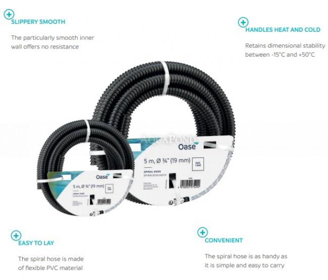 Praktikus 5 m hosszú tömlőszakasz. Ez a fekete, rugalmas PVC spiráltömlő különösen praktikus, könnyű és könnyen hordozható. 32 mm átmérőjével ideálisan illeszkedik 1 1/4"-os fugához. Nagyon jól bírja a környezeti hatásokat, mivel -15 és +50 °C között bírja, és fagyban és erős UV sugárzásban is megőrzi teljes teljesítményét sugárzás.A nagyon sima belső fal biztosítja az ellenállásmentes áramlást.Garantáltan nehézfémmentes,nem szennyezi a vízben a növény- és állatvilágot.1 bar üzemi nyomásra alkalmas.OASE csúcsminőség:2 év garanciát kapsz.