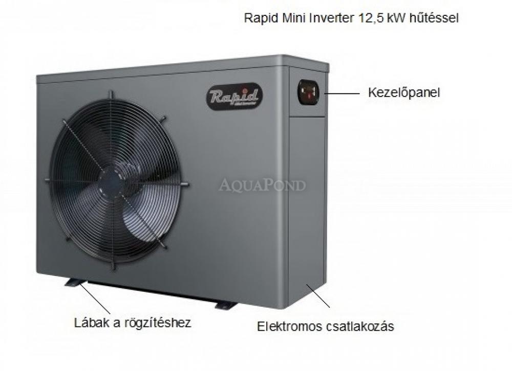 Fairland Rapid Mini Inverter RMIC13 hőszivattyú hűtéssel, 12,5 kW 55 m3-ig (+ Wi-Fi modul és téli takaró)A Rapid Mini Inverter egy step-inverter funkcióval rendelkező hőszivattyú 55 m3-es medencékig. A Step-inverter technológia abban különbözik a konvencionális hőszivattyúktól, hogy három kapacitáson működik: 25, 50, és 100%. Ez halkabb és költséghatékonyabb üzemeltetést eredményez. A "lépcsős kompresszornak" köszönhetően a hőteljesítmény intelligens módon 20% és 100% között állítható be a különböző fűtési igényeknek megfelelően (a klasszikus hőszivattyúk 100% -on be- vagy kikapcsolnak). Az automatikus energiaszabályozás segítségével a vizet folyamatosan melegíti. A hőszivattyú telepítése, üzemeltetése egyszerű és gazdaságos. Az új, R32 hűtőközeg bevezetésének köszönhetően a hőszivattyú nagyon környezetbarát. A kézi beállítás azt jelenti: